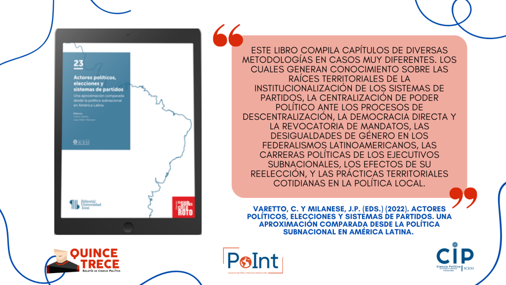 - Juan Pablo Milanese y Carlos Varetto (2022) Actores políticos, elecciones y sistemas de partidos. Una aproximación comparada desde la política subnacional en América Latina, Cali, Universidad Icesi. https://www.icesi.edu.co/editorial/actores-politicos/
