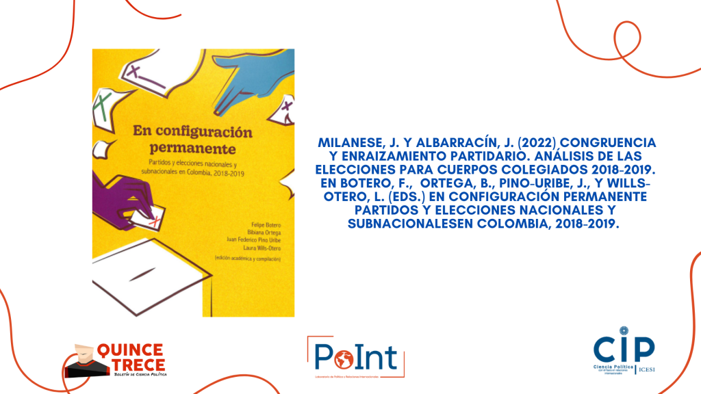 - Juan pablo Milanese y Juan Albarracín (2022) Congruencia y enraizamiento partidario. Análisis de las elecciones para cuerpos colegiados 2018-2019. En Felipe Botero, Bibiana Ortega, Juan Federico Pino Uribe y Laura Wills-Otero (eds.) En configuración permanente Partidos y elecciones nacionales y subnacionales en Colombia, 2018-2019. Bogotá, Pontificia Universidad Javeriana/Universidad de los Andes https://ediciones.uniandes.edu.co/reader/en-configuracion-permanente-1666309447?preview=true
