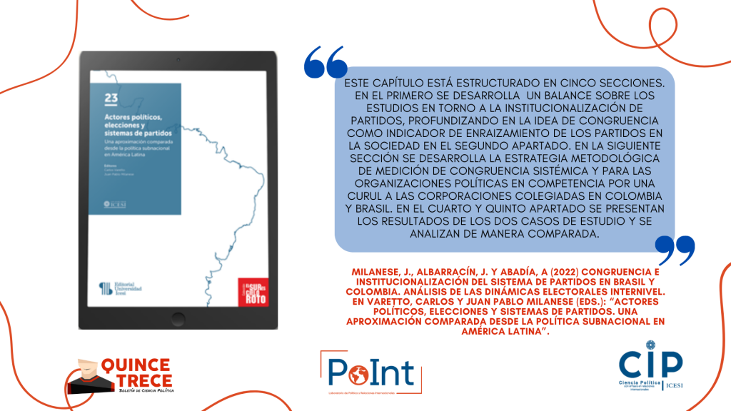 - Juan Pablo Milanese, Juan Albarracín y Adolfo Abadía (2022) Congruencia e institucionalización del sistema de partidos en Brasil y Colombia. Análisis de las dinámicas electorales internivel. En Varetto, Carlos y Juan pablo Milanese (eds.): “Actores políticos, elecciones y sistemas de partidos. Una aproximación comparada desde la política subnacional en América Latina”, Cali, Universidad Icesi https://www.icesi.edu.co/editorial/actores-politicos/