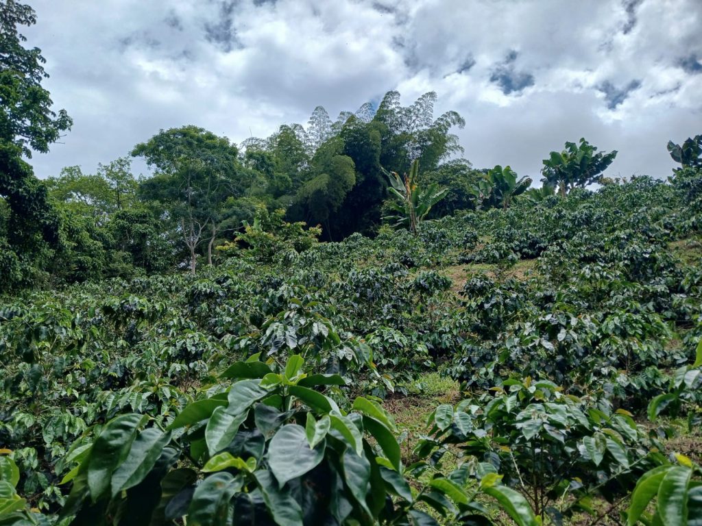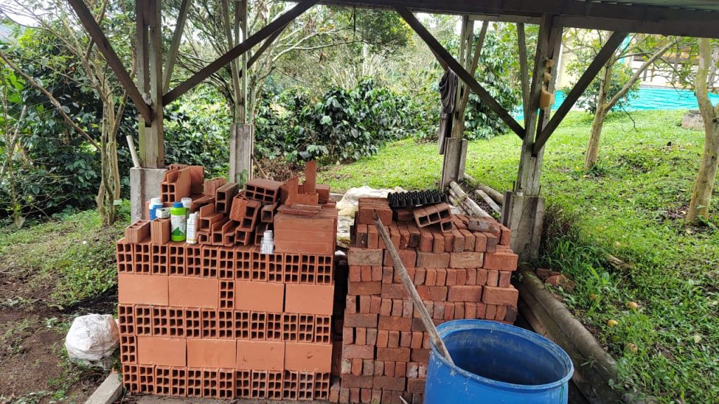 Cuando llegamos al final, nos comentaron la manera en que han usado el bosque de guadua para construir los centros de secado e incluso canales para los sistemas de riego de una huerta de hortalizas que tienen en la parte superior de la finca. Lo que nos pareció más importante fue la importancia que tiene para ellos el agua. Parece que la zona puede llegar a tener temporadas muy secas lo que induce mucho estrés en las plantas de café y hace que suelten su fruto antes de tiempo, sin contar con el color y tamaño adecuados. Por esta razón contactaron ingenieros para que les ayudaran a buscar agua subterránea y así poder crear un reservorio que les ayuda a mantener un riego constante en el terreno.