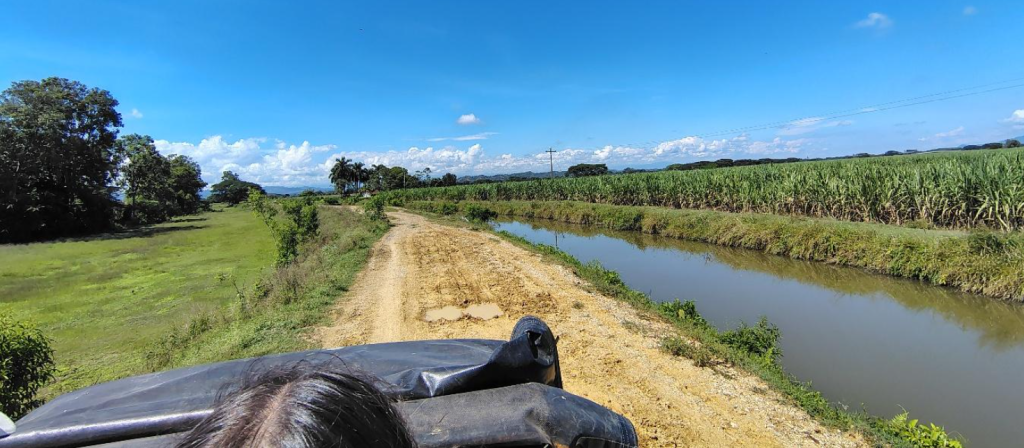 Después de un largo viaje de casi 4 horas, llegamos finalmente. Al dejar nuestras maletas en el hotel, nos comunicamos con Shayen para acordar dónde nos veríamos. Al encontrarnos, ella nos recibió con calidez y, pocos minutos después, llegó su papá, Andrés, en un Jeep, él se presentó y nos invitó a subir. Durante el trayecto —unos veinte minutos— atravesamos extensos cultivos de maracuyá, uva; también se desplegaban ante nosotros grandes terrenos con cultivos de caña de azúcar, que se extendían hasta donde alcanzaba la vista.