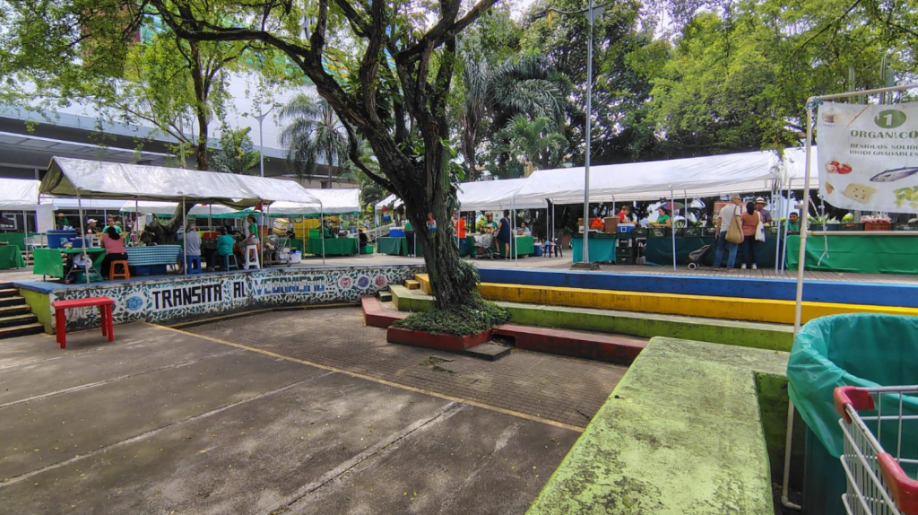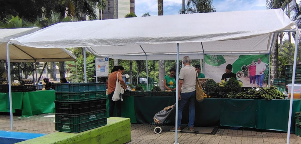 Teniendo en cuenta lo anterior, el sábado 5 de julio de 2025, Juliana y yo nos encontramos a las diez de la mañana, en el parque junto al centro comercial Palmetto, en Cali. Allí habíamos acordado reunirnos con nuestra interlocutora, Ana, una de las integrantes más reconocidas del mercado. Al llegar, la vimos acercarse a nosotras, pudimos distinguirla gracias a que portaba una camiseta verde que tenía en la parte delantera un logo que venía acompañado del nombre del mercado: Asoproorgánicos, que la identificaba como parte de esa comunidad de productores. Juliana y yo nos presentamos y Ana nos dio la bienvenida y, casi de inmediato, nos invitó a seguirla al interior del mercado.