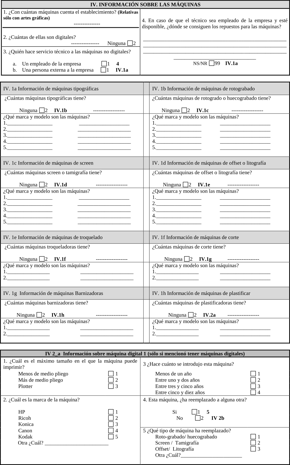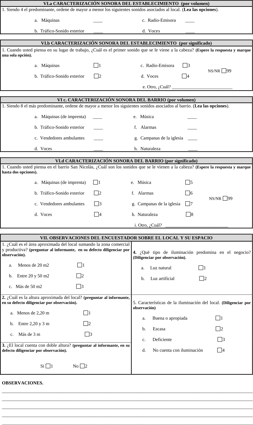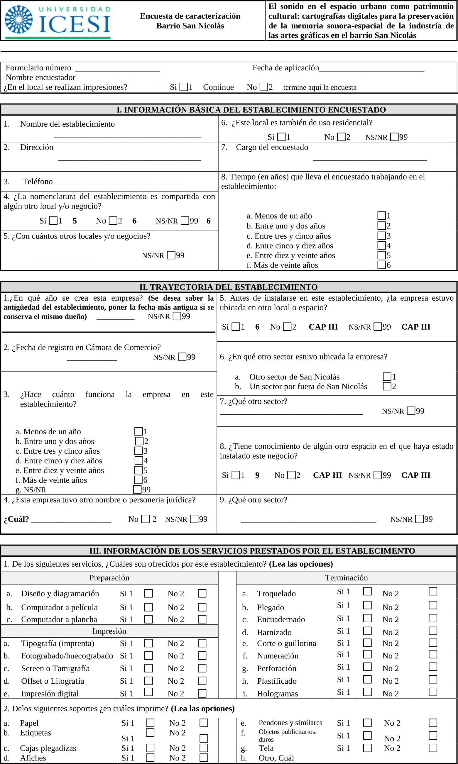 El instrumento tenía como fin hacer una caracterización general de las imprentas en San Nicolás, que incluyera no sólo los datos básicos como nombre y dirección, sino que además indagara por información sobre los servicios ofrecidos, la maquinaria existente, las dinámicas laborales, así como la percepción sonora del entorno y su relación con el espacio.