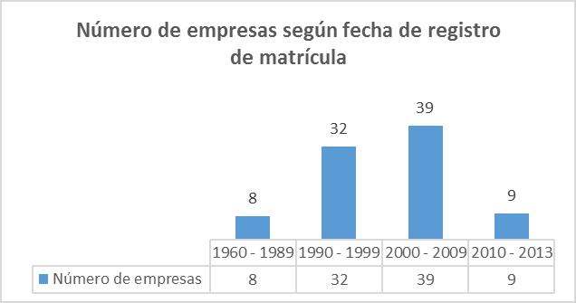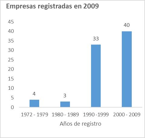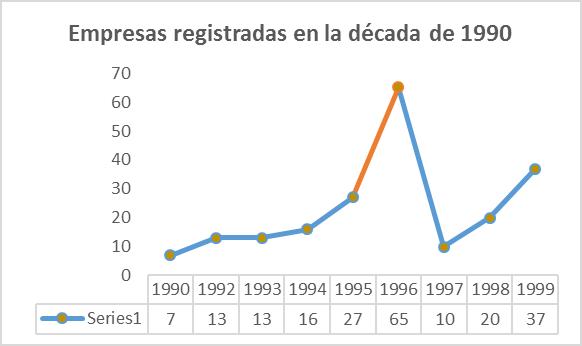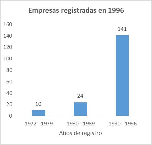 Llama la atención que, de acuerdo con las bases de datos de empresas activas a 1996, el mayor número de matrículas comerciales tienen lugar en la década de 1990. No obstante, para 2009 encontramos una reducción significativa, presentándose solo el 23% de las empresas en el periodo referido. En especial la década de 1990 el mayor pico de empresas se encuentra para 1996 tal como lo refleja la siguiente gráfica.