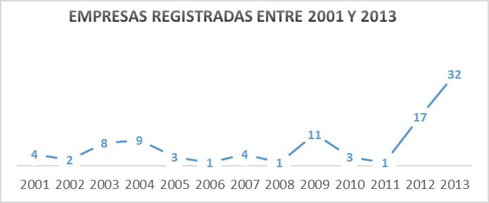 Entrados en la década del 2000 no se alcanzará un registro similar de empresas como se obtuvo en la anterior década, lo cual indica un sostenimiento relativo de las ya creadas; aunque se nota que el 2012 trae consigo un cambio en esta dinámica y se evidencia un nuevo crecimiento en las matrículas.