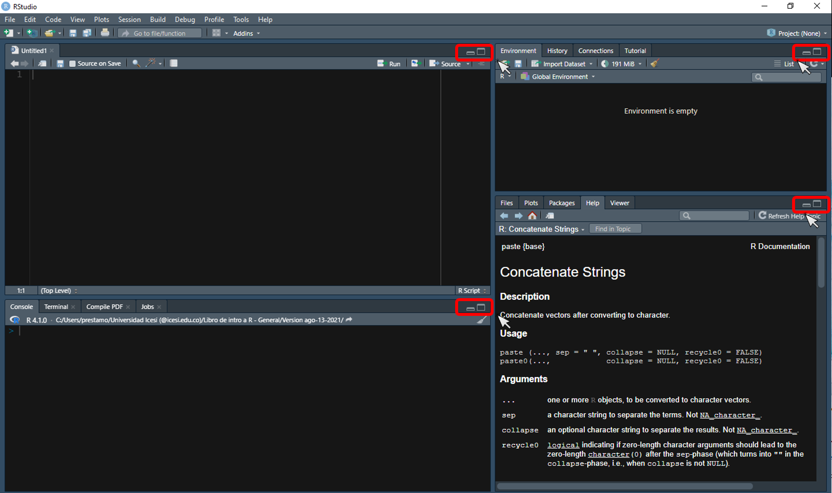 También es posible maximizar o minimizar los páneles en RStudio dando clic a los iconos en la barra superior de cada pánel como se muestra en la Figura 3.10, o bien puedes personalizar los tamaños de cada pánel arrastrando el cursor en los bordes de cada uno.