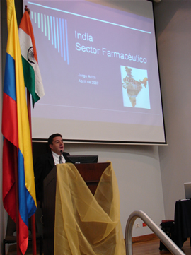 Tuvimos la oportunidad de escuchar la experiencia de dos empresas colombianas: Tecno- químicas, una gran empresa farmacéutica, y Tantra Imports Ltda., una microempresa. Jorge Enrique Ariza, vicepresidente de Tecnoquímicas, y Luis F. Fuenmayor, propietario de Tantra Imports Ltda. nos presentaron un análisis del mercado indio, según sus respectivos intereses, y las ventajas y desventajas de la negociación con dicho país.