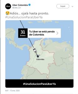 de sus redes sociales oficiales, Uber Colombia anunció su salida del país, con la frase: “Adiós… ojalá hasta pronto”, el hashtag #UnaSolucionParaUberYa.