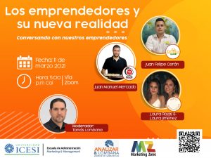 Marketing Zone se complace en invitarlo al conversatorio: Conversando con nuestros emprendedores “Los emprendedores y su nueva realidad”, que estará a cargo de Tomás Lombana, gerente de Analizar & Lombana, como moderador y contará con la participación de Juan Manuel Mercado, fundador de Sushi break S.A.S; Juan Felipe Cerón, socio de la empresa Mr.Platanitos y Laura Rojas y Laura Jiménez, creadoras de basics whereabouts.