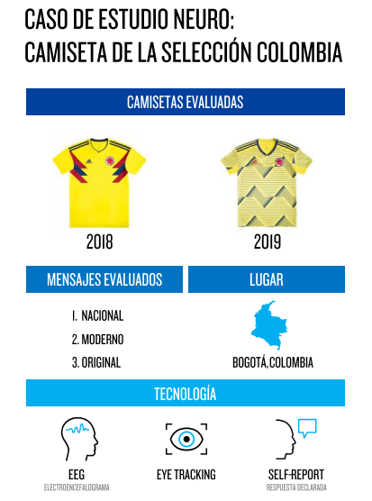» Se evaluaron las camisetas 2018 y 2019 de la Selección, para determinar si hay diferencias reales en la respuesta no consciente del consumidor entre los dos diseños. La evaluación comprendió tanto la respuesta cerebral ante el diseño como su capacidad de generar asociaciones con tres mensajes elegidos por Nielsen Neuro: nacional, moderno y original. El trabajo de campo se realizó en el laboratorio de Nielsen Consumer Neuroscience en Bogotá e incluyó una muestra representativa de colombianos*, entre los 24 y 54 años de edad con gusto particular por el fútbol. De estos 50% eran mujeres y 50% hombres. «