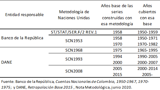La elaboración de cuentas nacionales se inició en Colombia a finales de los años cuarenta. Las primeras series, que fueron producidas por el Banco de la República, empiezan en 1945 y llegan, con diversas modificaciones, hasta 1982. A partir de ese año, el DANE asumió la responsabilidad de producir las cuentas nacionales. La metodología de elaboración de las cuentas nacionales se basa en las recomendaciones de las Naciones Unidas, que buscan que todos los países del mundo sigan pautas semejantes de preparación de las cuentas con el fin de que las estadísticas sean comparables internacionalmente. Periódicamente, las Naciones Unidas actualizan y refinan sus recomendaciones metodológicas, dando lugar a un proceso de ampliación y sofisticación del sistema de cuentas. Las cuentas nacionales de Colombia han seguido este proceso, como veremos en este capítulo.