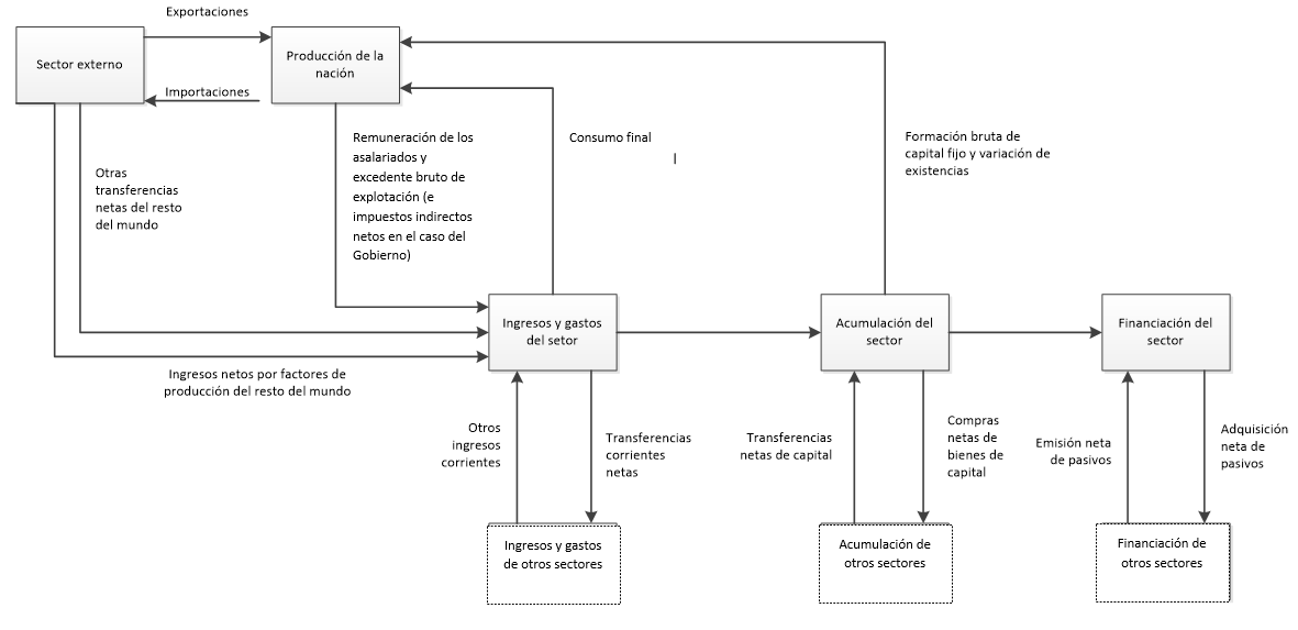 Las cuentas de los hogares y el gobierno están comprendidas en la cuenta agregada del ingreso nacional. Si se consolidan las tres sumando entradas con entradas y salidas con salidas se obtiene: