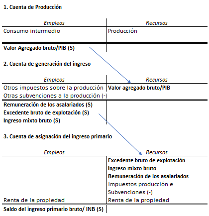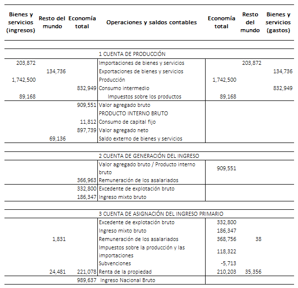 Las cuentas agregadas para la nación continúan con la distribución del producto interno bruto o valor agregado entre los agentes de la economía, según el factor de producción. Cuando al PIB se le adiciona el resultado neto de las operaciones de distribución primaria del ingreso con no residentes, es decir, los ingresos netos en el exterior de los factores trabajo y capital nacionales, se llega al ingreso nacional bruto a precios de mercado: