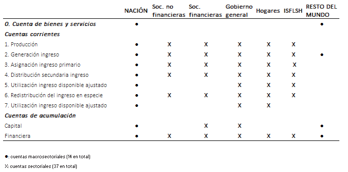 Las cuentas reales se ubican en las primeras ocho columnas del cuadro. Las cuentas de acumulación aparecen en las últimas dos columnas, mostrando que la cuenta financiera ya ha sido integrada definitivamente al sistema. Finalmente, en el cuadro no se incluyen las cuentas de balance, porque éstas aún no se encuentran disponibles en el país.