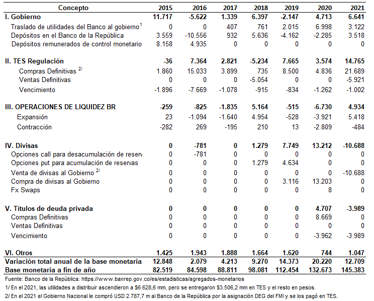 Sin embargo, esta forma de ver el origen de la base monetaria no es muy práctica porque no permite identificar fácilmente los canales de expansión y contracción. Por ejemplo, el valor de las reservas internacionales puede elevarse por efecto de un aumento en el tipo de cambio, pero esto no implica que haya expansión monetaria, ya que ese efecto queda compensado contablemente por el aumento del patrimonio del Banco de la República (obsérvense los cambios desde 2014 en ambas variables). De forma semejante, un aumento contable en el crédito bruto a la Tesorería puede no ser expansivo si simplemente es la contrapartida de mayores pasivos no monetarios en títulos del gobierno (como ocurrió en 2016). Por esta razón, el Banco de la República presenta un cuadro de fuentes de la base monetaria, donde se resumen las fuentes de expansión y contracción (Cuadro 15.3). Por ejemplo, en 2015, la expansión de la base monetaria se debió casi totalmente al gobierno, que recibió recursos a través de los depósitos en el Banco de la República (es decir, disminuyeron, lo que explica el comportamiento de los pasivos no monetarios del Cuadro 15.3). En cambio, las divisas no generaron ningún efecto de expansión o contracción de la base en 2015 (a pesar de que su valor aumentó por efecto del tipo de cambio). Las operaciones de liquidez del Emisor no tuvieron un efecto de importancia sobre la base en 2015. Estas operaciones de liquidez son básicamente operaciones repo, que se hacen sobre todo con los bancos comerciales, y que consisten en adquirir con compromiso de retroventa (devolución) títulos que han sido emitidos por el gobierno nacional, con lo cual se irriga (o absorbe) liquidez. El año 2021 fue muy interesante y muy distinto a otros años, debido sobre todo a la asignación de DEG a Colombia por parte del Fondo Monetario Internacional (los Derechos Especiales de Giro, DEG, le permiten a los países contar de inmediato como parte de las reservas internacionales el monto asignado sin contraprestación). El Gobierno Nacional le compró dólares al Banco de la República por la asignación de DEG y se los pagó con TES. Pero, por otro lado, el Banco de la República utilizó parte de esos TES para pagar al Gobierno Nacional parcialmente las utilidades del Banco, que son un ingreso fiscal (véase el Capítulo 16).