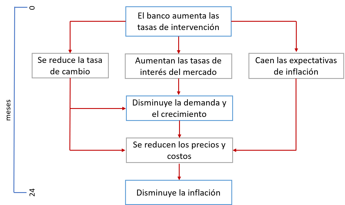 El tercer canal, que aparece a la derecha en el gráfico, es el que opera a través de las expectativas de inflación. Si las empresas y los consumidores confían en la capacidad del Banco de la República para lograr su objetivo de controlar la inflación, reforzarán el proceso, pues aceptarán más fácilmente que los precios y los salarios crezcan menos rápido de lo que ocurriría si la tasa de política monetaria y la tasa de cambio se mantuvieran donde estaban antes. Con un rezago que puede durar hasta 24 meses, estas fuerzas combinadas harán que se reduzcan el consumo y la inversión, se moderen los aumentos de costos y precios y baje la inflación.