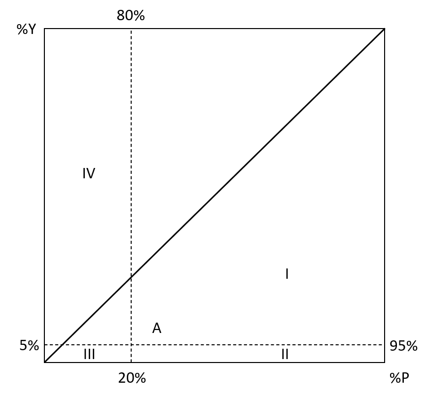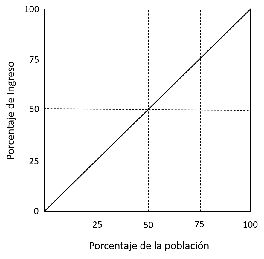 Puede aceptarse que el ingreso (u otra variable) se encuentra distribuido equitativamente entre los miembros de la población cuando a cada uno corresponde una fracción proporcional del total. Así, en una población de 100 miembros, si el ingreso se encuentra distribuido equitativamente, cada uno percibirá un 1% del total. Por tanto, en una distribución equitativa, un porcentaje cualquiera de la población recibe ese mismo porcentaje de ingreso. La “equidistribución” puede representarse, entonces, como una diagonal que relaciona los valores porcentuales de la variable del eje de las abscisas con sus correspondientes valores porcentuales de la variable del eje de coordenadas (véase Gráfico 4.1).