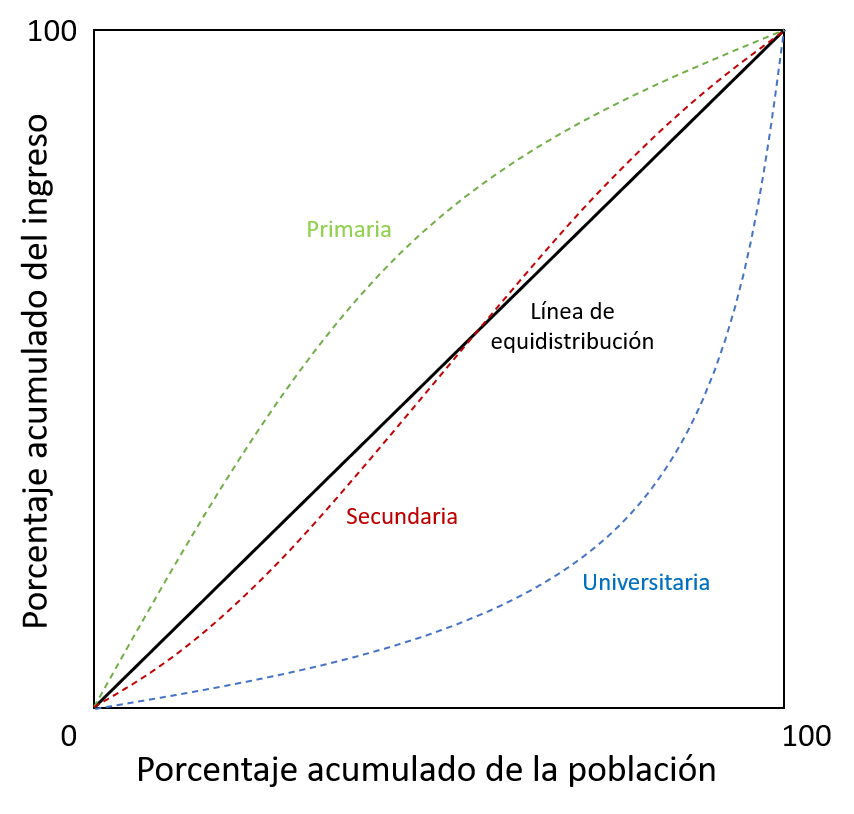 Las tres curvas del Gráfico 4.4 corresponden a tres casos de subsidio, según una de las primeras investigaciones que se hizo en América Latina sobre el impacto distributivo del gasto público en educación: gasto progresivo (primaria), aproximadamente equitativo (secundaria) y regresivo (universitaria), respecto a la distribución del ingreso. En el primer caso, el subsidio está corrigiendo sustancialmente la concentración del ingreso: la curva por encima de la diagonal indica que los estratos más pobres de la población reciben una mayor parte del subsidio. Lo contrario sucede con el subsidio en educación universitaria, el cual puede agravar la concentración del ingreso (lo que ocurre si la curva está totalmente a la derecha de la curva Lorenz del ingreso, que no está graficada). En cuanto al subsidio en educación secundaria, si bien mejora la distribución del ingreso (pues sin duda está a la izquierda de la curva Lorenz del ingreso), la curva corta la diagonal, indicando que resulta levemente regresivo dentro del grupo que constituye el 60% más pobre, y levemente progresivo dentro del 40% más rico.