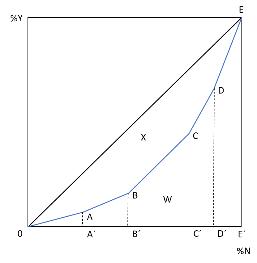 Si llamamos \(X\) el área entre la diagonal y la curva de Lorenz y \(Z\) el área total bajo la diagonal, el coeficiente de concentración de Gini es igual a \(X/Z\). A fin de deducir un método práctico para calcular el coeficiente de Gini, es conveniente notar que el área bajo la curva de Lorenz puede descomponerse en una serie de trapecios a partir de los puntos iniciales de construcción (Gráfico 4.5). Puesto que el coeficiente de Gini se define como \(X/Z\), se requiere calcular el área \(X\) del gráfico, sabiendo que el área \(Z\), que es la total bajo la diagonal, es 0.5 (pues cada lado del cuadrado mide 1). Por tanto, llamando W al área bajo la curva, se tiene que