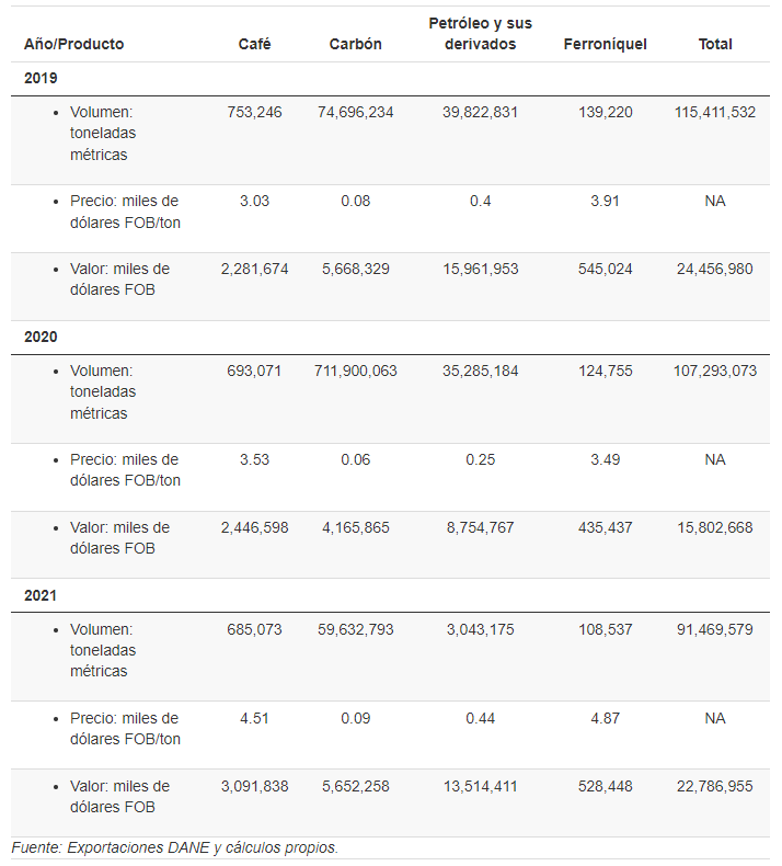 Considérese la información del Cuadro 5.3, que se refiere a los volumenes, precios y valores de los productos tradicionales de exportación en Colombia. Podrían construirse índices con base en los totales, o con base en los promedios simples de los productos. Esta alternativa tendría alguna validez para los datos de producción física, dado que todos se encuentran expresados en una unidad común y la agregación tiene un significado claro. Sin embargo, este método de calcular un índice de cantidades no es viable cuando se tienen productos heterogéneos, que no pueden reducirse a unidades físicas comunes. De otra parte, tampoco es totalmente adecuada para fines económicos, ya que asigna la misma importancia a una tonelada de cualquier producto, al margen de que sus valores puedan ser muy diferentes. La misma crítica puede hacerse a un índice de precios basado en los promedios de los cuatro productos, ya que se estaría dando igual importancia al precio del café que al precio del carbón, cuyos volumenes de producción son muy distintos. Estos índices basados en los promedios simples o en los totales tampoco permitirían deducir en qué medida las variaciones en el valor total de las exportaciones de productos tradicionales se deben a cambios en los volumenes producidos y en qué medida a mayores precios.