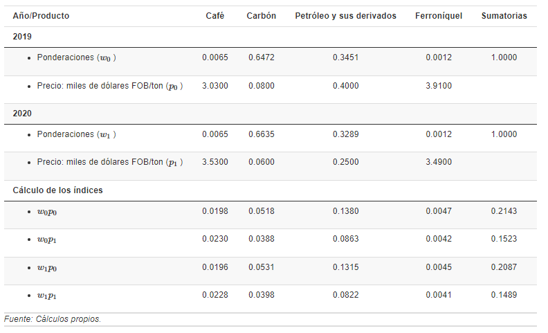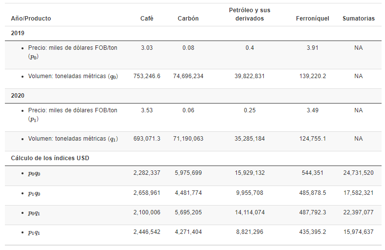 Queremos calcular los índices de cantidades a partir de la información del Cuadro 5.6. Cuando las cantidades de producto se valoran a los precios iniciales, se encuentra que el valor del producto a precios constantes de 2019 pasó de 24,731,520 USD a 22,397,077 USD entre ese año y 2020, de lo cual se deduce un índice de cantidades de Laspayres de 90.56, que implica una disminución del 9.44% en la exportación de los productos tradicionales. Si la valoración se efectúa a los precios de 2020, se obtiene un índice de Paasche de 90.86 que implica una disminución del 9.14% en las cantidades producidas. Nuevamente, la diferencia en los dos cálculos es modesta, y no hay un criterio para decidir cuál de los dos cálculos es mejor.