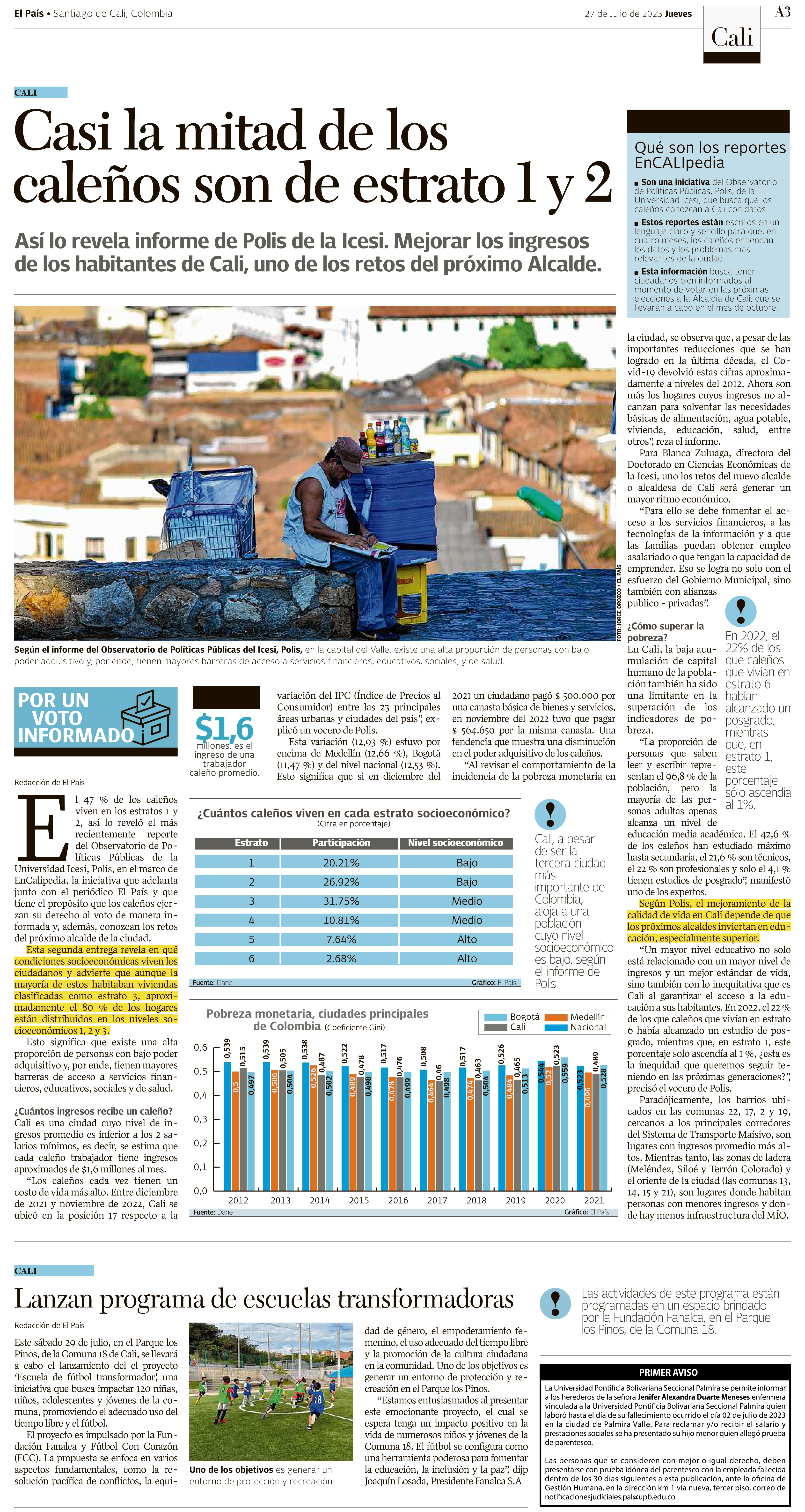 El 47% de los caleños viven en los estratos 1 y 2, así lo revelo el más reciente reporte del Observatorio de Políticas Públicas de la Universidad Icesi, Polis, En el marco de EnCALIpedia, la iniciativa que adelante junto con el periódico EL País y que tiene el propósito que los caleños ejerzan su derecho al voto de manera informadas y, además, conozcan los retos del próximo alcalde de la ciudad.
