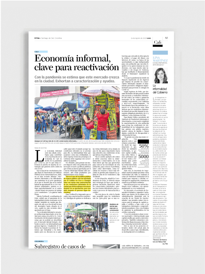 Esta noticia explica la importancia del enfoque de la caracterización gubernamental de la población para la elaboración de políticas públicas adecuadas en medio de un desequilibrio económico producto de una crisis sanitaria. Especialmente en una ciudad con más de 10200 vendedores ambulantes y en un lugar, el centro de Cali, un epicentro en donde se concentran 5000 de ellos a realizar su principal actividad económica. Según Valeria Trofimoff, coordinadora de Polis, se necesita: "conocer el problema, saber cómo intervenirlo, cómo focalizar los recursos y hacer más eficiente la gestión para mejorar la calidad de vida de los vendedores”.