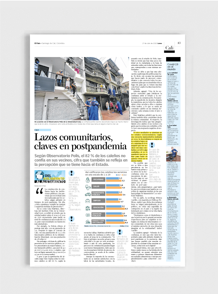La construcción de un ambiente de ciudad está planteada bajo los parámetros de la confianza en los demás. La percepción sobre los vecinos y el estado son factores influyentes en el comportamiento de los caleños para superar esta situación en la post-pandemia.