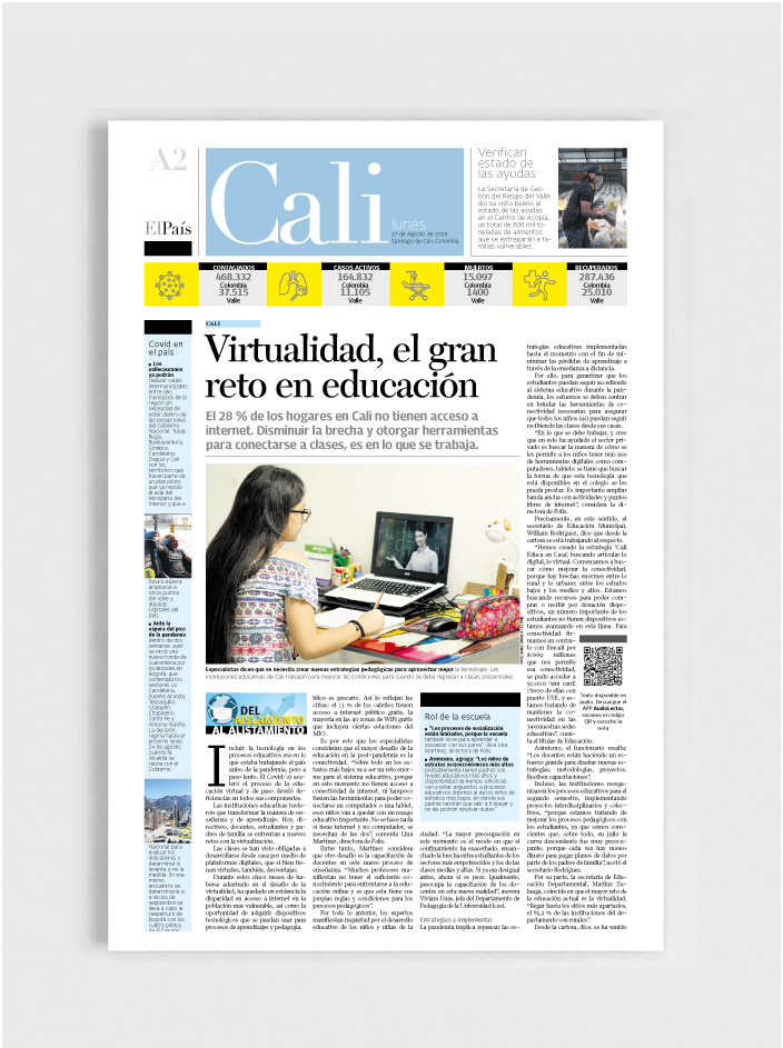 Directivos, docentes, estudiantes y padres de familia están afrontando las problemáticas consecuentes a la crisis sanitaria con un cambio en el sistema educativo. Esta noticia explica la situación del caso de Cali y en él se dan datos que explican la realidad caleña como el hecho de que el 28% de los hogares de la ciudad no tiene acceso a internet.