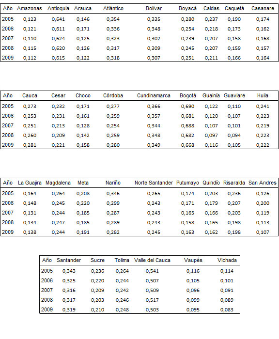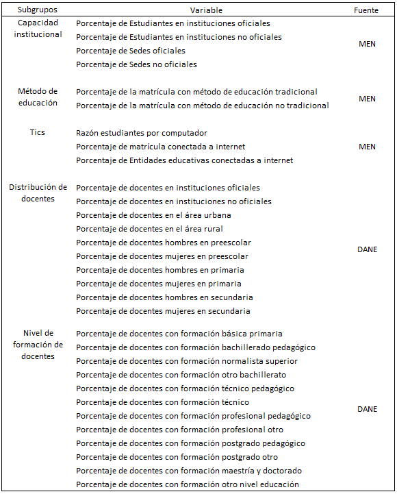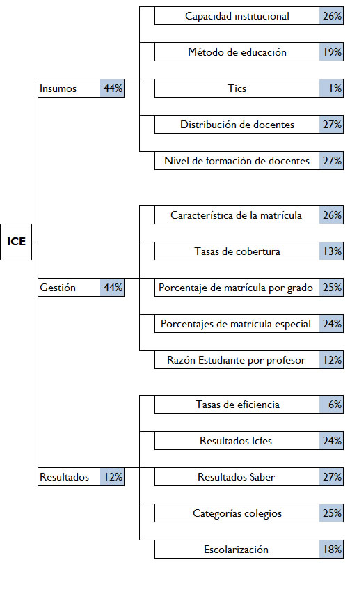El primer grupo de la estructura del ICE, el grupo de insumos, el cual comprende la estructura base necesaria para que el sistema de educación pueda funcionar bajo parámetros de calidad y eficiencia en los procesos administrativos, abarca lo relacionado con recursos humanos (cantidad de personal docente y nivel de formación), infraestructura física (cantidad de instituciones educativas y sedes por institución) y TIC’s (porcentaje de la matrícula conectada a internet, relación estudiante por computador, etc.). Lo anterior es coherente con la importancia de poder contar con profesores formados pero también con una capacidad instalada, todo lo cual hace parte de la estructura base u organizacional del sistema de educación que permite brindar el servicio (ver Tabla 1).