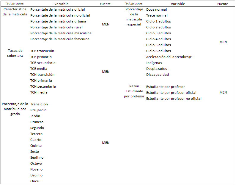 Por otra parte, con el segundo grupo se busca analizar los esfuerzos realizados por los agentes involucrados en el sistema, los cuales se encuentran orientados al mejoramiento continuo de la calidad desde el punto de vista de los elementos relacionados con el funcionamiento del sistema de educación y con la respuesta a las necesidades y demandas. Se tienen en cuenta variables relacionadas con la cobertura en la prestación del servicio educativo por áreas, género, por tipo de población (en condición especial y vulnerable), entre otras (ver tabla 2).