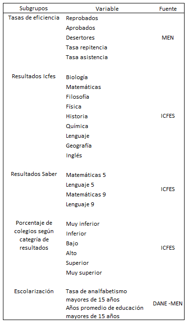 Finalmente, el último grupo del ICE se refiere al de resultados, el cual comprende variables relacionadas con los logros educativos. Para esto se identifican variables que hacen referencia al posicionamiento institucional según los resultados de las pruebas de conocimiento, variables relacionadas con la eficiencia del sistema educativo, entre otras (Ver tabla 3).