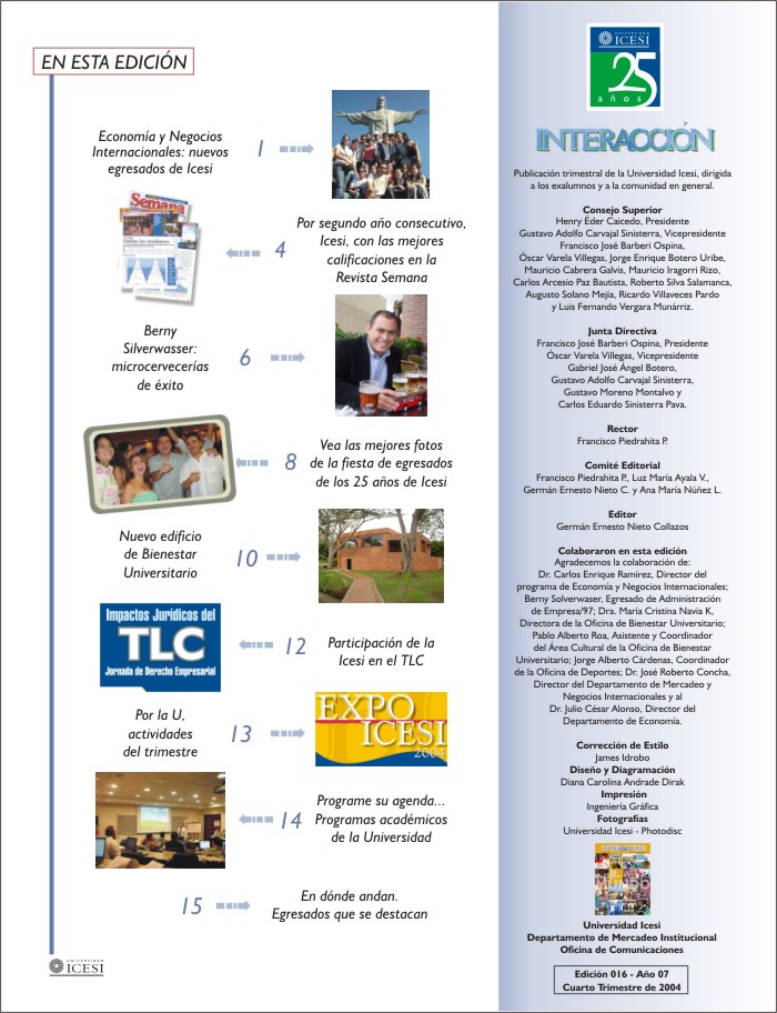 Programas académicos ¿En dónde andan? Por la U. Participación Icesi en el TLC Nuevo edificio de Bienestar Universitario Fotos de fiesta de egresados - 25 años de Icesi Berny Silverwasser: Microcervecerías de éxito Icesi con las mejores calificaciones en la Revista Semana Economía y Negocios Internacionales: Nuevos egresados de Icesi