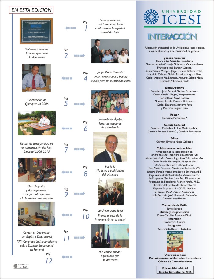 ¿En dónde andan? CDEE Dos abogados y dos ingenieros: una fórmula efectiva a la hora de crear empresa Celebración Quinquenios 2006 Universidad Icesi Universidad Icesi Reconocimiento: La Universidad Icesi contribuye a la equidad social del país Profesors de Icesi: Calidad que hace la diferencia Jorge Mario Restrepo: Tesón, honestidad y lealtad. La Receta de Ágape: Ideas innovadoras + experiencia Rector de Icesi y el Plan Decenal 2006-2015 Por la U Universidad Icesi frente al reto de la intervanción en lo social Departamento de Mercadeo Institucional