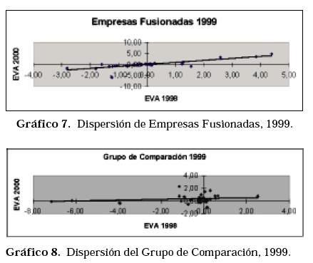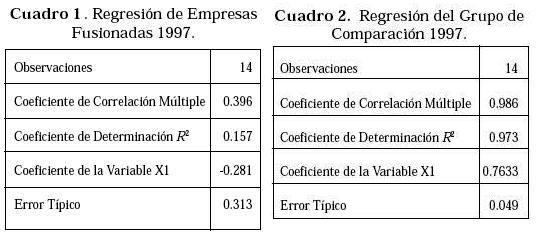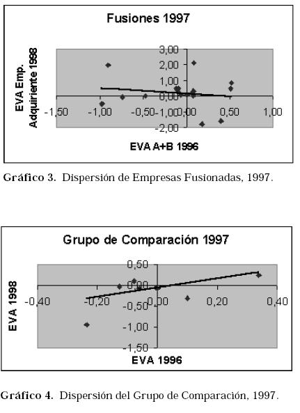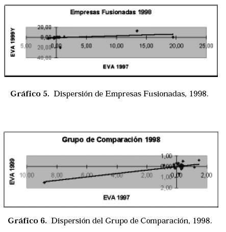 En 1997 esta estrategia hizo que las empresas fusionadas tuvieran un desempeño deficiente (Cuadro 1) en cuanto a generación de valor comparado con aquellas empresas que no la llevaron a cabo (Cuadro 2). (Gráficos 3 y 4). En efecto, la la comparación de coeficientes de la variable X1 muestra una pérdida de valor agregado en una relación de -28.1% para las empresas fusionadas, mientras una conservación de valor agregado en una relación del 76,3 % para las no fusionadas.