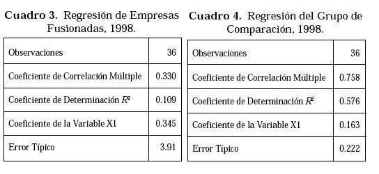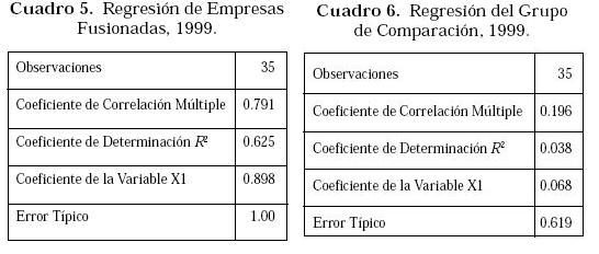 A esta serie de observaciones se le realizó una regresión lineal y se determinó como factor de evaluación la pendiente obtenida en cada uno de los casos; si la pendiente obtenida para los datos de las empresas fusionadas era mayor que para las empresas del grupo de comparación, concluíamos que esta estrategia había contribuido a generar valor en el corto plazo.
