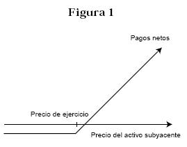 Para un call los pagos netos son negativos (iguales al precio pagado por la call) si el valor del bien subyacente es menor que el precio strike. Si el precio del activo subyacente excede el precio de ejercicio (strike), el pago total es la diferencia entre el valor del activo subyacente y el precio strike, y el pago neto es la diferencia entre el total de los pagos y el precio de la call. Esto se ilustra en la Figura 1.