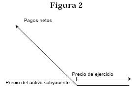 Una put tiene unos pagos negativos si el valor del bien subyacente excede el precio de ejercicio y tiene unos pagos totales equivalentes al diferencial entre el precio de ejercicio y el valor del bien subyacente, si el valor del activo es menor que el precio de ejercicio. Esto es resumido en la Figura 2: