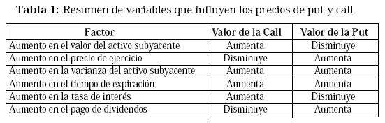 Dado que el comprador de la opción pague el precio de la opción por adelantado, un costo de oportunidad está incluido. Este costo dependerá del nivel de la tasa de interés y del tiempo de expiración de la opción. La tasa de interés sin riesgo también entra en la valoración de la opción cuando el valor presente del precio de ejercicio es calculado, aunque el precio de ejercicio no tiene que ser pagado (recibido) hasta la expiración de la call (put). Incrementos en la tasa de interés aumentarán el valor de la call y disminuirán el valor de la put. La Tabla 1 resume las variables y los efectos mencionados sobre los precios de las puts y calls.