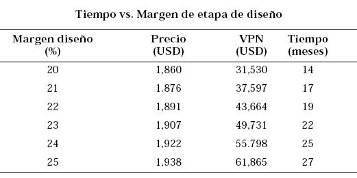 En la siguiente tabla se muestra el tiempo que soportaría el proyecto para distintos márgenes de ganancia en la etapa de diseño, de modo que se pueda seguir siendo competitivo. Se ha tomado como variable el margen de la etapa de diseño ya que es la que entrega las ganancias. El máximo margen es del 25%, ya que entrega un valor de USD $1,938 el cual seguiría siendo menor a los USD $1,945 que ofrece Incode en la etapa de diseño.