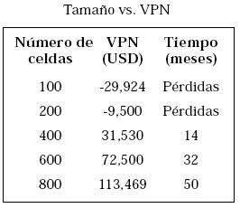Costos fijos mensuales US $2.250 Costos variables por celda US $4.240