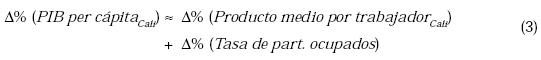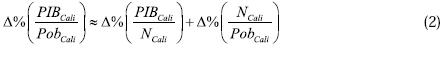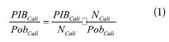 Donde PIBCali, PobCali y NCali denotan el PIB, la población total y el número de personas ocupadas en Santiago de Cali, respectivamente. Manipulando algebraicamente es fácil demostrar que: