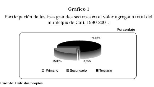 La economía del municipio de Cali en 2001 se caracterizaba por una participación muy grande del sector de servicios, contribuyendo con un 74,02% del valor agregado total municipal. El sector secundario (industria y construcción) participaba con el 25,63% del total del valor agregado. Finalmente el sector primario (sector agropecuario y minero) aportaba únicamente el 0,35% del valor agregado municipal (Ver Gráfico 1). Esta composición de la economía caleña es muy parecida a la de Santafé de Bogotá, donde el sector terciario participa con un 74.54%, el sector secundario con un 24.97% y el primario con un 0,49%.