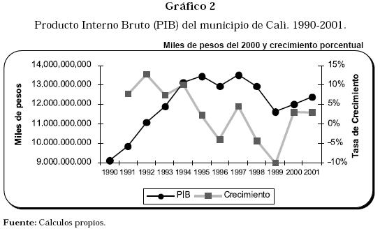 Estos resultados reflejan la innegable crisis económica que experimentó la economía caleña durante finales de la década de los años noventa. Existen diferentes hipótesis para explicar las razones de la crisis, que en su mayoría son recogidas en Echavarría, Fainboim, Zuleta (2003).5 Pero por primera vez se cuenta con una herramienta para evaluar el comportamiento global de la economía del municipio de Cali y comprobar algunas de estas hipótesis.