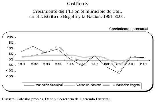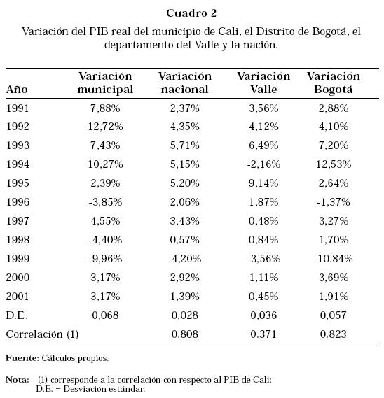 Una primera hipótesis para explicar la crisis de los años noventa tiene que ver con la similitud entre la dinámica de la producción municipal y la evolución de la producción nacional. La variación del PIB municipal tiene una correlación de 0.808 con la variación del PIB nacional, y de hecho existe una correlación más fuerte entre la variación del PIB de Cali y el Distrital (correlación de 0.823). Además, la correlación que existe entre el PIB nacional y el de Bogotá es mucho más alta: 0,875.6 (Ver Gráfico 3 y Cuadro 2).
