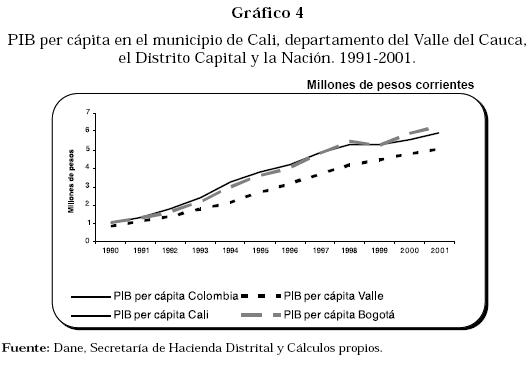 Una última hipótesis en materia de la evolución y comportamiento de la actividad económica de los años noventa se atribuye a un problema de competitividad de largo plazo. Para evaluar esta hipótesis se puede considerar el comportamiento del PIB per cápita de Cali. El PIB per cápita municipal es superior al nacional y al departamental en todo el período de estudio, pero para algunos años el PIB per cápita del Distrito Capital ha sido superior al PIB municipal (ver Gráfico 4).