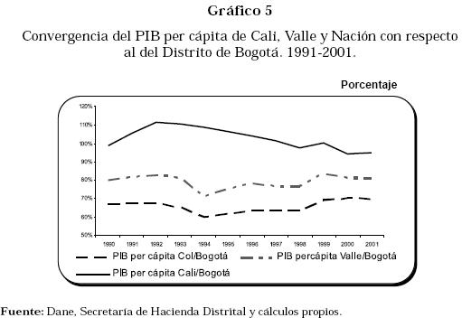 No es sorprendente que la capital posea un mayor PIB per cápita que la nación, el departamento del Valle, ni que el municipio de Cali. De hecho es interesante comparar cómo se ha estrechado la diferencia entre el PIB per cápita de las distintas regiones con el de Bogotá. Esto se puede observar si se divide cada uno de los PIB per cápita por el distrital. En caso de que este cociente sea menor que uno significará que el PIB per cápita de Bogotá es mayor, caso contrario ocurrirá si el cociente es mayor que uno (Ver Gráfico 5).