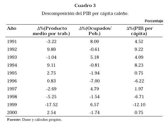 Al descomponer el PIB per cápita municipal de acuerdo con la expresión (3) se obtienen unos resultados muy interesantes (Ver Cuadro 3). En 1991 y 1993 el PIB per cápita creció gracias a un aumento en la cantidad de ocupados que compensó la caída en la productividad media por trabajador. Pero en 1994 y 1995 el PIB per cápita aumentó; no obstante, la tasa de participación disminuyó, gracias a los aumentos en la productividad media. En 1998 y 1999 el PIB per cápita baja gracias a una fuerte caída de la productividad media por trabajador. Específicamente en 1999 la proporción de ocupados aumentó en un 6,57%, el PIB per cápita cayó gracias a la fuerte caída de la productividad media por trabajador. Para el 2000, la recuperación del PIB per cápita se dio por la leve recuperación de la productividad media.