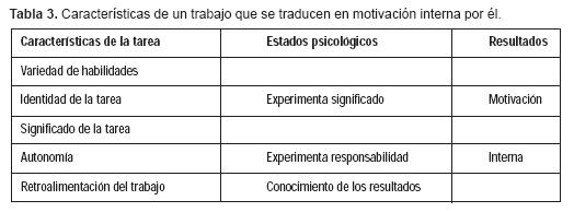 En cuanto al diseño del trabajo, el modelo que se recomienda es igual al que se utiliza para el diseño del trabajo individual. El criterio que se sigue es el que las tareas que se realizan y los estados psicológicos que de ellas se derivan deben conducir a una motivación interna por el trabajo. Esta situación se resume en la Tabla 3.