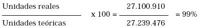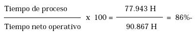 Este indicador nos muestra el aprovechamiento del tiempo que se tuvo durante el proceso. Se origina de la razón entre el tiempo de proceso y el tiempo neto operativo (medido en horas).